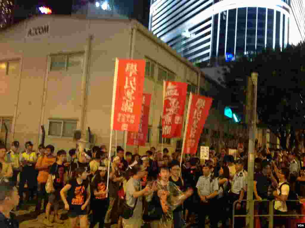 在香港泛民和占中运动在特区政府总部外的添马公园举行的有近万人集会后,数以百计的学生和市民游行前往人大常委会副秘书长李飞下榻的湾仔君悦酒店,要求与李飞对话,抗议人大常委会对香港政改全面落闸......以下是美国之音记者海彦从现场拍摄的照片。